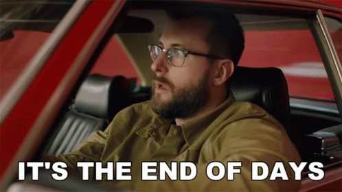 Dylan Slocum in a car, with the text 'IT'S THE END OF DAYS' displayed on screen.