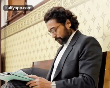 Suriya as Lawyer Chandru intently reviews documents, preparing for an argument.