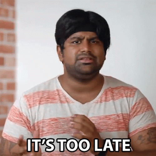 Ashwin Ganesh, wearing a striped shirt, says "It's too late" with a concerned expression.
