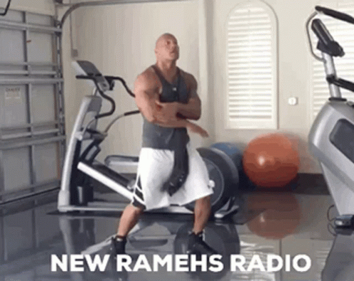 A man dances energetically in a gym, with 'NEW RAMEHS RADIO' text displayed on screen.