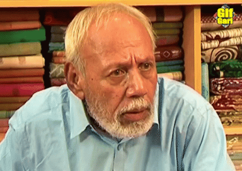 Bangladeshi actor Atm Shamsuzzaman reacts with a wide-eyed, surprised expression in a fabric store.