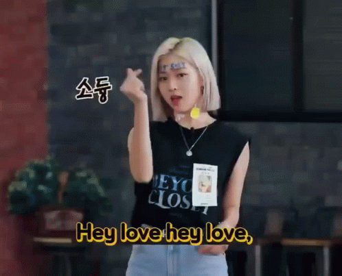 Itzy's Ryujin makes a heart gesture, showing love and cuteness with on-screen lyrics.