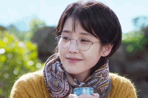 a woman wearing glasses and a scarf is holding a cup of coffee