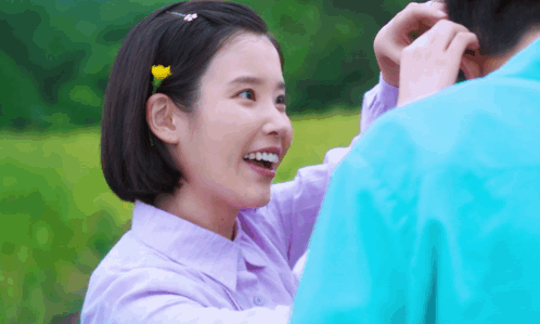 a woman with a yellow flower in her hair smiles while touching a man 's ear