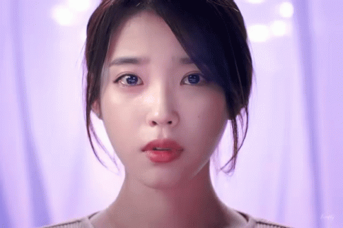 IU's emotional close-up as she sheds a tear, with a soft purple background.