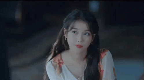 IU shows a charming expression with a slight smile, wearing a floral top and delicate earrings.