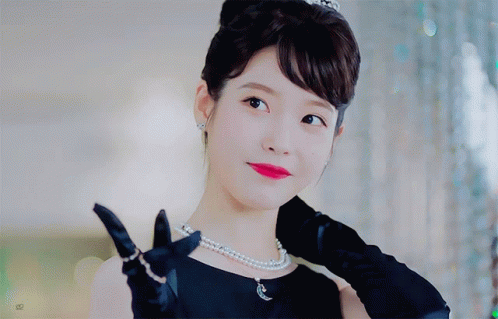 IU (아이유) poses elegantly, wearing a pearl necklace and black gloves with bright red lipstick.