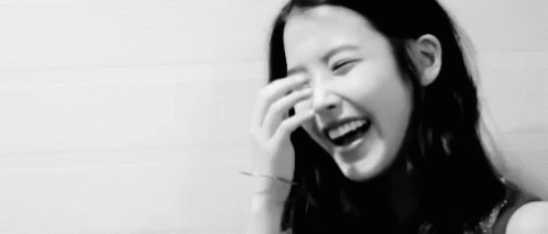 Kpop star IU shares a cute and funny laughing moment, covering her face with her hand.