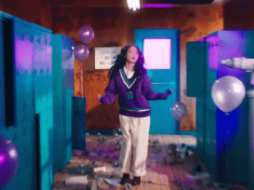 IU Lee Ji Eun dancing in a vibrant room with balloons and lockers, showcasing K-pop moves.