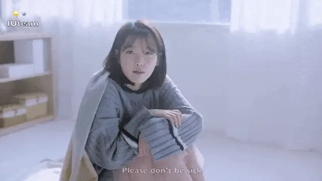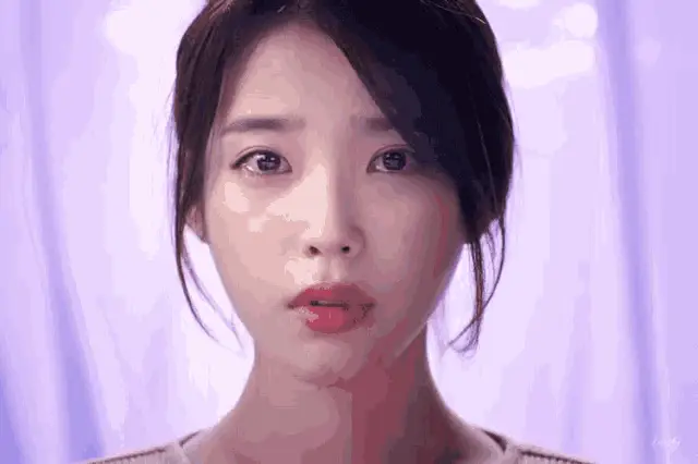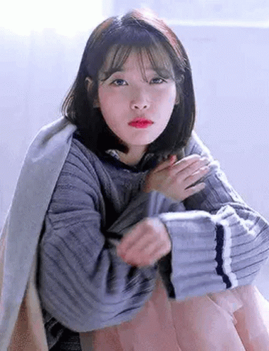 IU Lee Ji Eun posing in a cozy striped sweater and a light pink skirt.