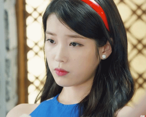 IU (Lee Ji Eun) with a red headband and blue top, looking up with a thoughtful expression.