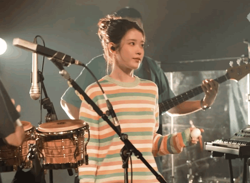 a woman in a striped sweater stands in front of a microphone while a man plays a guitar
