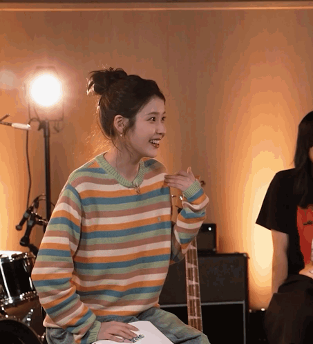 a woman in a colorful striped sweater is smiling