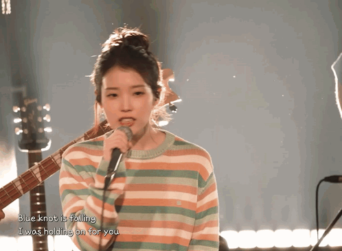 a woman singing into a microphone with the words blue knot is falling below her