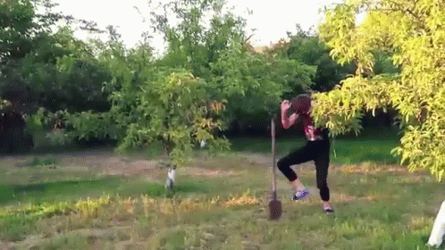 Ee One Guy (Ивангай) performs an energetic and quirky dance in a garden with a shovel.