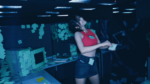Yujin from Ive dancing in a vibrant office covered in sticky notes, wearing a red top.