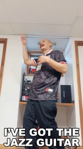 Doggface208 enthusiastically dances to 'Ive Got The Jazz Guitar' in a room, showing off his moves.