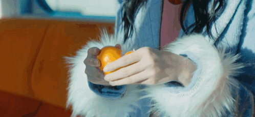 a woman in a blue fur coat is holding an orange