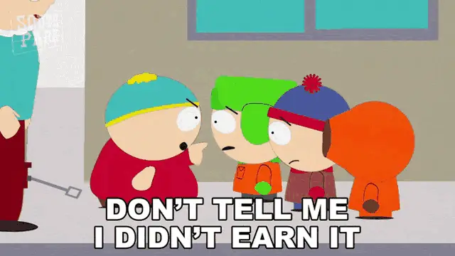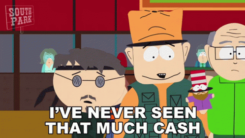 Jimbo Kern, Ned Gerblanski, and Herbert Garrison react to a large amount of cash in South Park.