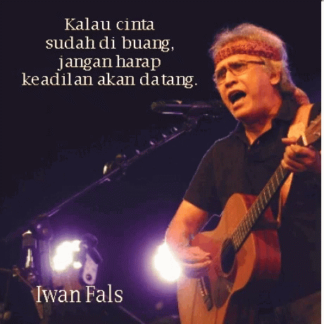 Iwan Fals performing live, singing and playing guitar, with a powerful quote about love and justice.