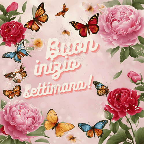 A vibrant greeting for a good start to the week, featuring beautiful butterflies and blooming peonies.