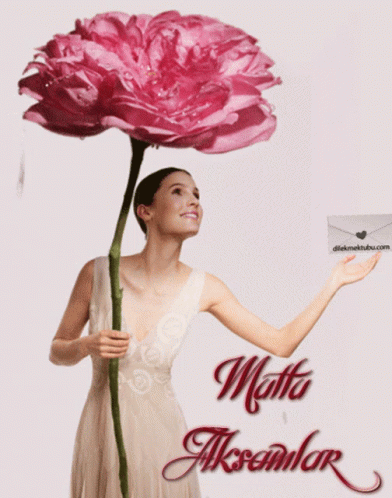 Woman in white dress holding a giant pink flower, with a 'Mutlu Akşamlar' (Happy Evenings) message.