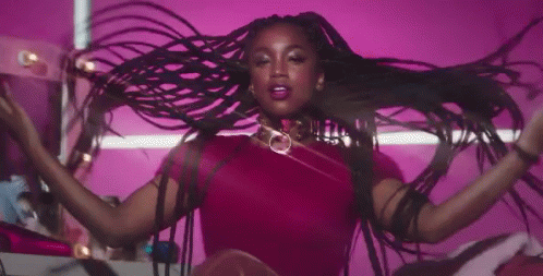 Iza Ebem striking a pose with her long braids fanned out against a vibrant pink background.