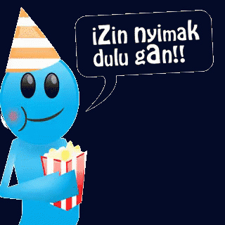 A funny cartoon character in a party hat eats popcorn while saying 'Izin Nyimak' (I'm just watching first).