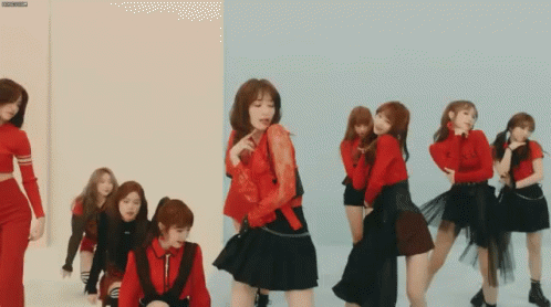 Izone's Miyawaki Sakura and group members perform a dynamic dance in red and black outfits.
