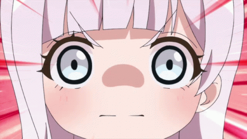 Izumo Saki from D4dj Petit Mix looks shocked with wide eyes and an open mouth against a red background.