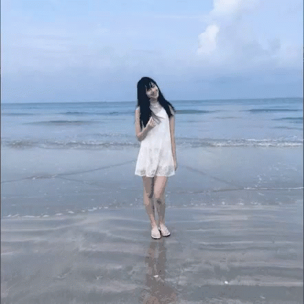 Jaabnk48 Jaa smiles while standing in the shallow water on a beautiful beach.