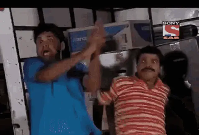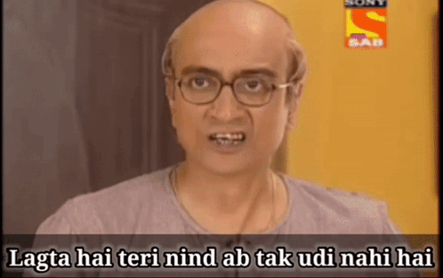 Champaklal and Jethalal from TMKOC in a funny scene, with Champaklal trying to wake Jethalal up.