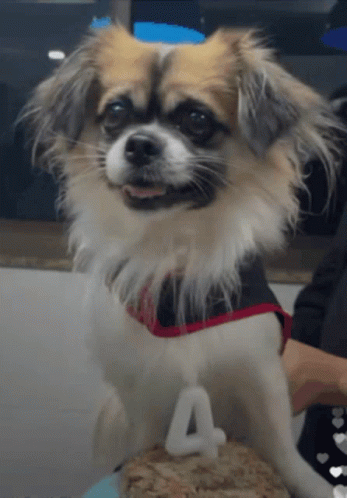 Jackbacon Gizelly, a fluffy brown and white dog, celebrates its 4th birthday with a candle.