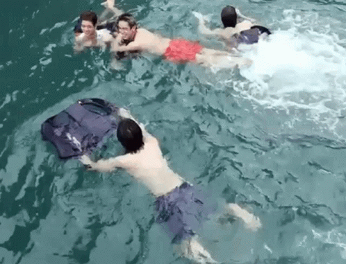 Jackiejackrin and Trinitytnt swimming in the water with others, one person holding a black bag.