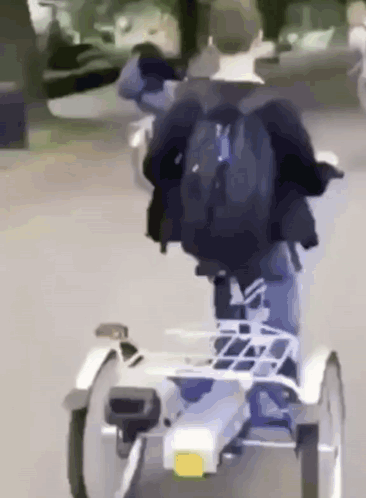 Jacko, a man with a backpack, rides a unique three-wheeled bicycle down a tree-lined street.