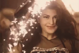 Jacqueline Fernandez smiles brightly with sparkling lights around her, looking glamorous.