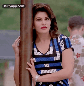 Jacqueline Fernandez leans against a pole, looking intently at the camera in a stylish patterned dress.