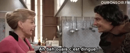 Jacquouille and a woman in a kitchen, exclaiming 'Ah bah ouais c'est dingue!'