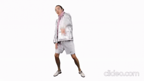 Jacuś Jacus shows off his funny dance moves in a silver jacket and pink scarf, performing against a white and purple background.
