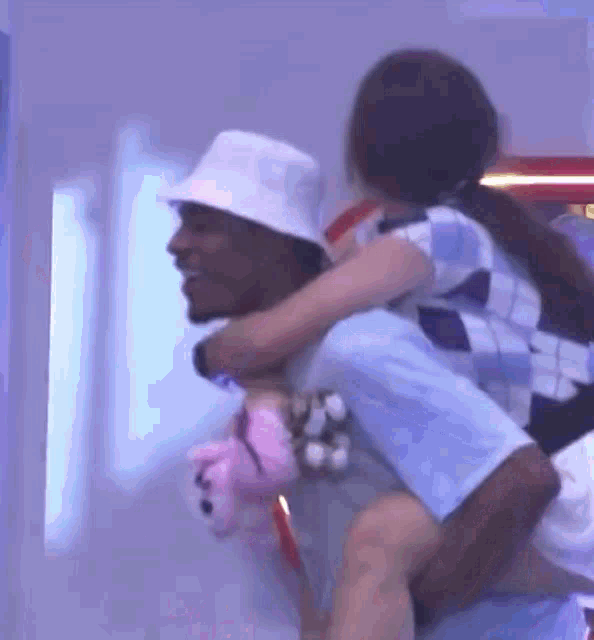 Jade Picon gets a piggyback ride from Paulo Andre, holding a pink plush toy, at a lively BBB party.