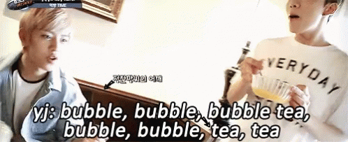 B.A.P members Youngjae and Daehyun (Jae Dae) enjoy bubble tea, with Youngjae playfully singing about the drink.