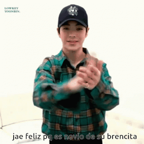 Jae Hyuk Yoon Jaehyuk dancing happily while wearing a plaid shirt and a baseball cap.