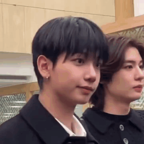 Jaehyun from BOYNEXTDOOR with his signature "Bread Mochi" look, wearing a black coat and white shirt.