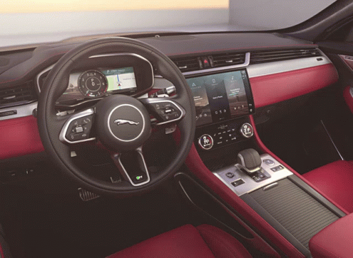 Experience the luxurious and technologically advanced interior of the Jaguar F-Pace, featuring a sleek dashboard and red accents.