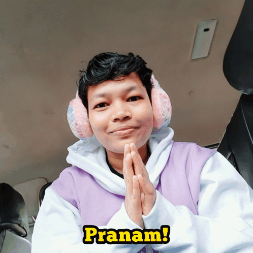 Jagyasini Singh, wearing ear muffs and a purple sweater, offers a 'Pranam' greeting.