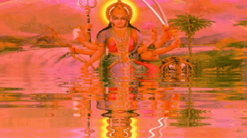 A vibrant depiction of Maa Durga with multiple arms, reflected in water, surrounded by flowers and changing colors.