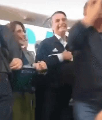 Jair Bolsonaro smiles and interacts with a crowd, while another man speaks into a microphone at an indoor event.