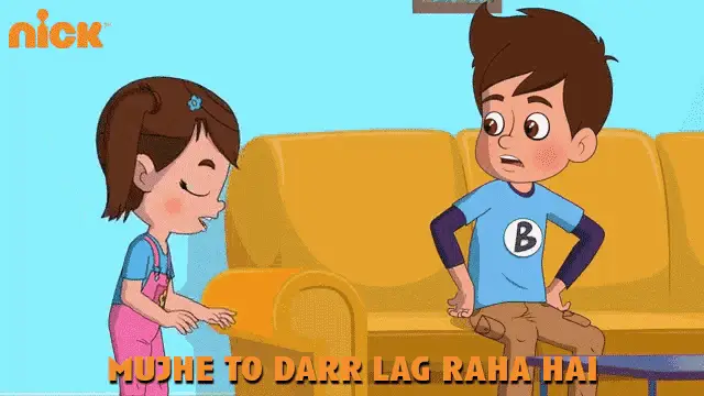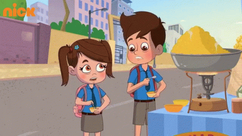 Bitto and Choti, in school uniforms, look unwell at a street food stall, possibly after eating Daaduji's junk food.