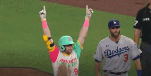 Jake Cronenworth of the Padres celebrates a walk-off victory with arms raised in the air.