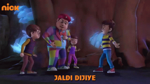 Rudra, Maira, Rangeela, and Varun from Rudra Boom Chik Chik Boom stand together with 'Jaldi Dijiye' text.